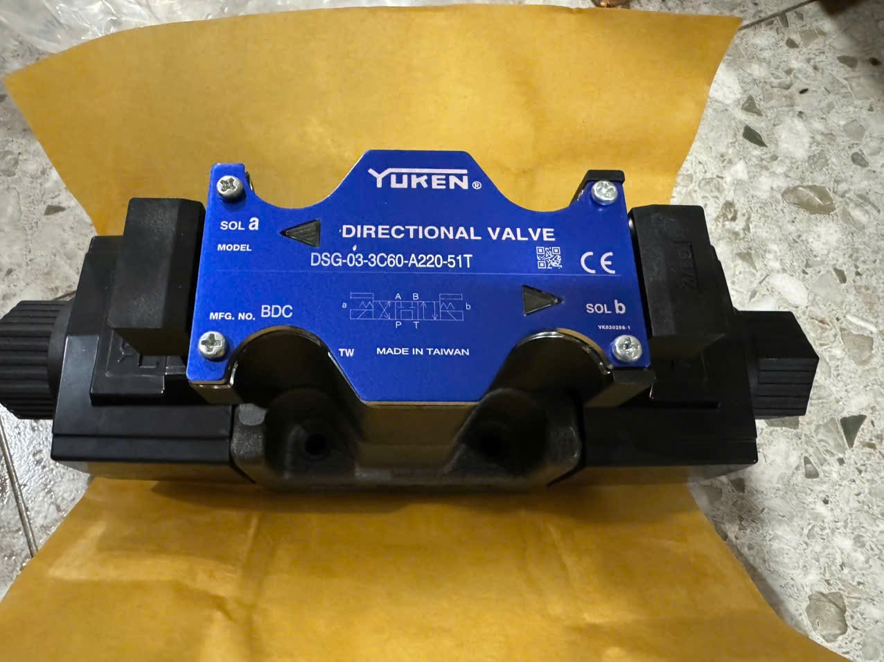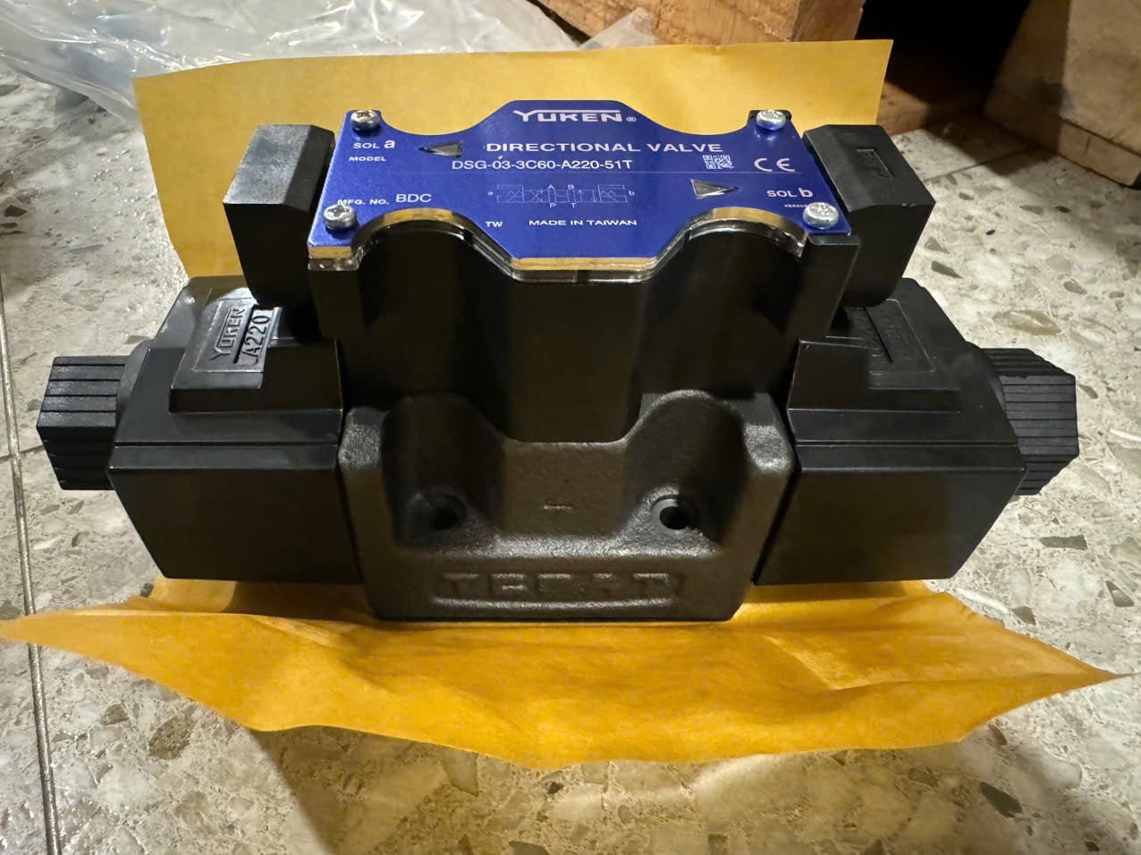 Van điện từ Yuken DSG-03-3C60-A220-51T là dòng van phân phối điện từ 4/3 (4 cổng – 3 vị trí) kiểu Closed Center thuộc series DSG-03 size lớn của Yuken Taiwan. Model này có coil AC 220V, lưu lượng cao, chuyên dùng cho các hệ thống thủy lực công suất lớn đòi hỏi độ kín trung tâm tuyệt đối.