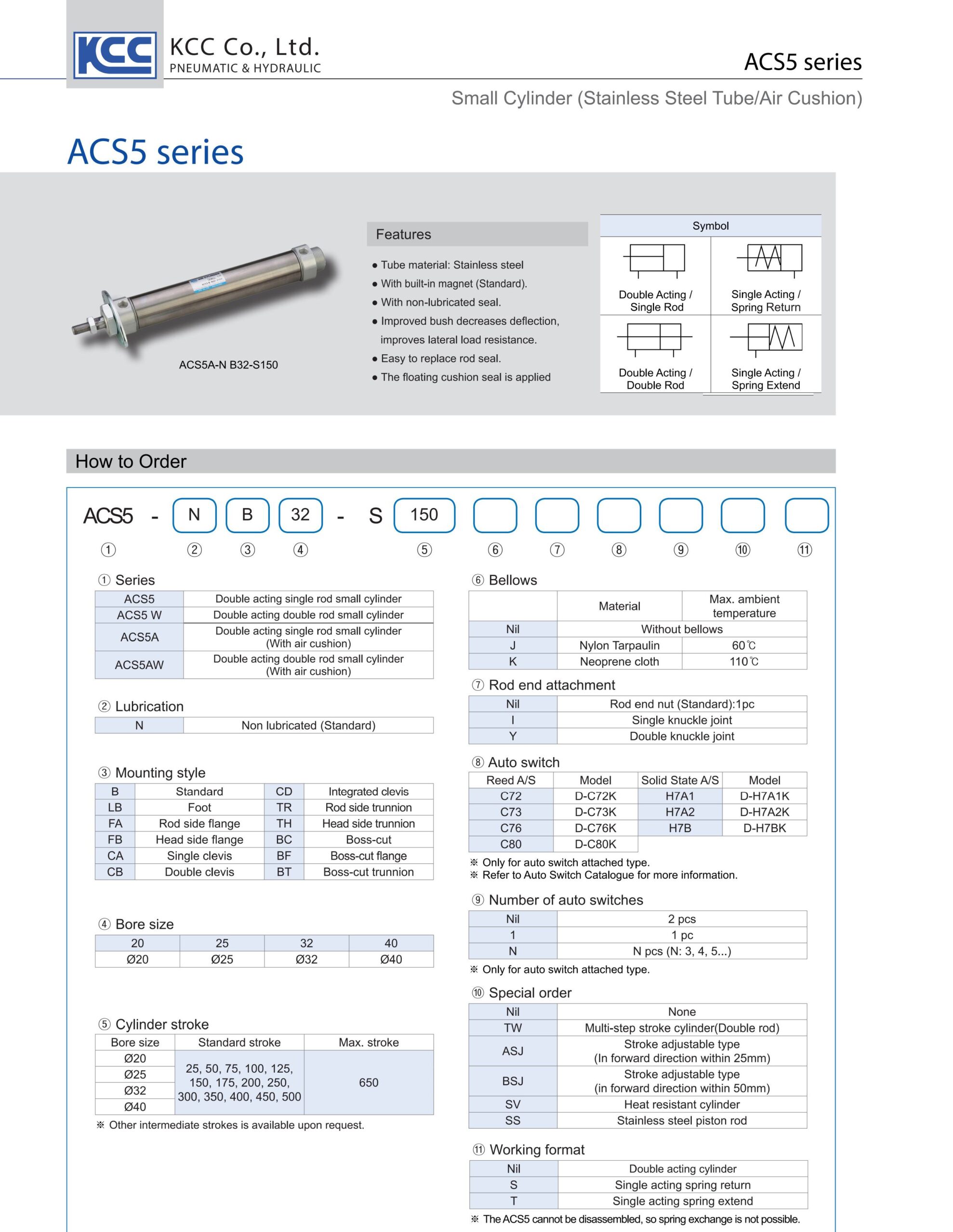 Xi Lanh Khí Nén Tròn KCC Ø32 - ACS5-NCD32 | Lực Tốt - Độ Bền Cao. ACS5-NCD32 – Lực đẩy ổn định, dùng rộng rãi trong máy công nghiệp nhỏ, băng chuyền, thiết bị đóng gói.